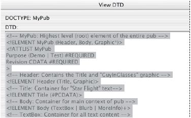 En DTD-fil inneholder et sett med objekter og attributter som medlemmene i gruppen skal bruke. Filen definerer også regler for hvor objekter skal vises i strukturhierarkiet. DTD-filen kan for eksempel angi at tittelobjektet skal være underordnet artikkelobjektet, fordi tittelen skal vises i selve artikkelen. Hvis du angir en kode for en tittel uten å angi en artikkelkode, merker DTD-filen tittelobjektet som ugyldig. Du kan søke etter og merke feil med ugyldig struktur i en InDesign-fil ved hjelp av en DTD-fil. Denne prosessen utfører en kontroll.