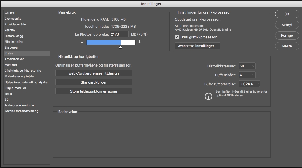 Photoshop benytter bildebufring til å gjøre tegningen av bilder med høy oppløsning raskere mens du jobber med dem. Du kan angi opptil åtte nivåer med bufrede bildedata, og velge én av fire tilgjengelige panelstørrelser.