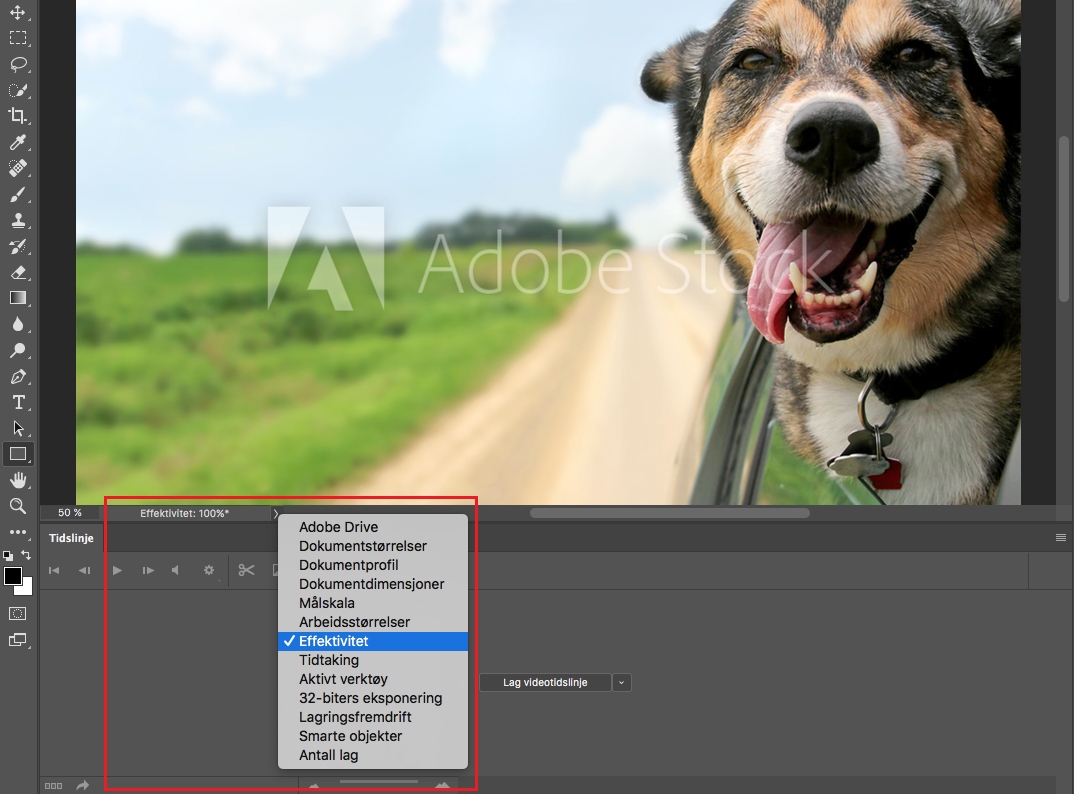 Hold et øye med effektivitetsindikatoren for å overvåke ytelsen mens du arbeider i Photoshop. Klikk på hurtigmenyen nederst i bildevinduet, og velg Effektivitet.