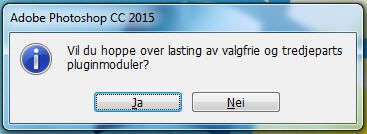 Hold nede Shift-tasten og start Photoshop. Det åpnes en dialogboks under åpningen med spørsmålet «Vil du hoppe over valgfrie og tredjeparts plugin-moduler?»
