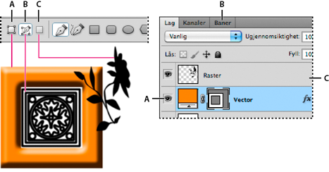 Du tegner i Adobe Photoshop ved å lage vektorformer og baner. I Photoshop kan du tegne med hvilket som helst av formverktøyene, pennverktøyet eller frihåndspennverktøyet. Du finner alternativer for hvert verktøy på alternativlinjen.