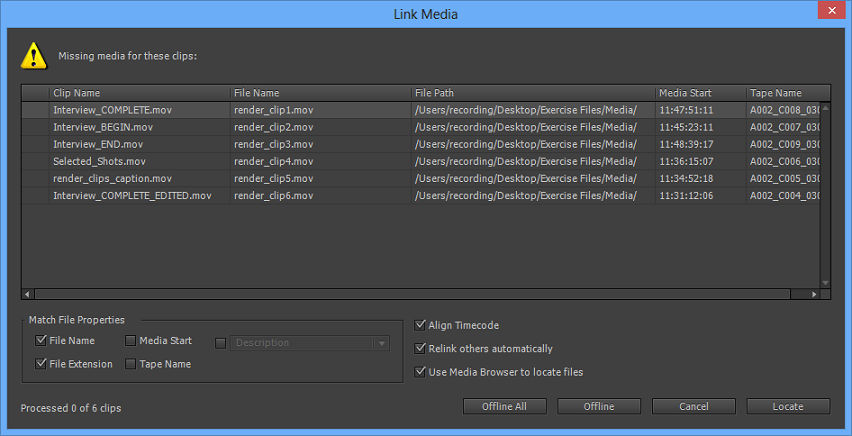 At any point later, you can open the Link Media dialog box and relink the offline clips in your project by doing one of the following: