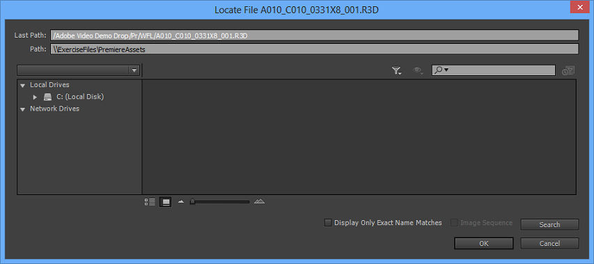 To help you narrow down your search results, the Locate File dialog also provides you with advanced filter options, like displaying specific file types and selecting Display Only Exact name Matches. In addition, you can switch from a list view to a thumbnail view for a visual confirmation of a specific media file.