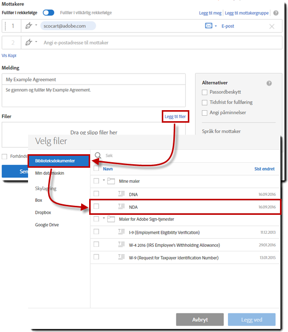 Etter å ha valgt mal (eller arbeidsflyt) og klikket på Start blir brukeren flyttet til Send-siden med den allerede vedlagte malen.