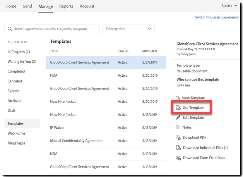 - Maler som er tilgjengelige for hele kontoen, laster inn Send-siden med malen vedlagt og Send fra valgt åpen, slik at brukeren kan konfigurere den.