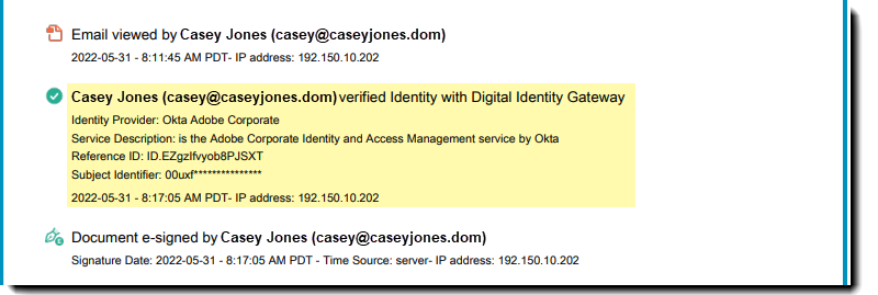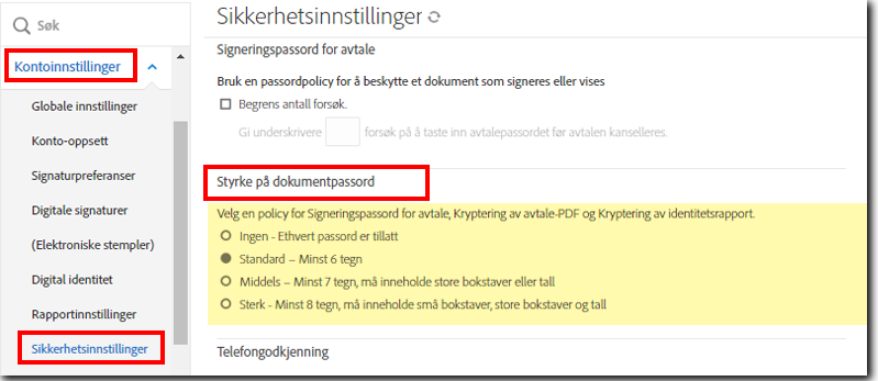 - Når dette er aktivert, lagres identitetsbekreftelsesinformasjonen på Acrobat Sign-servere og kan hentes ved hjelp av SIR.