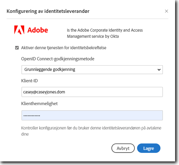 Adobe Okta IDP brukes i denne dokumentasjonen kun til eksempelformål. Kunder har ikke tilgang til denne IDPen.