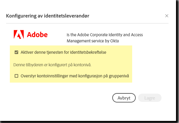 Hvis avmerkingsboksen Aktiver denne tjenesten for bekreftelse ikke er merket og linjen er grå når du viser en IDP-konfigurasjon på gruppenivå, er IDP-tjenesten på kontonivå ikke konfigurert.