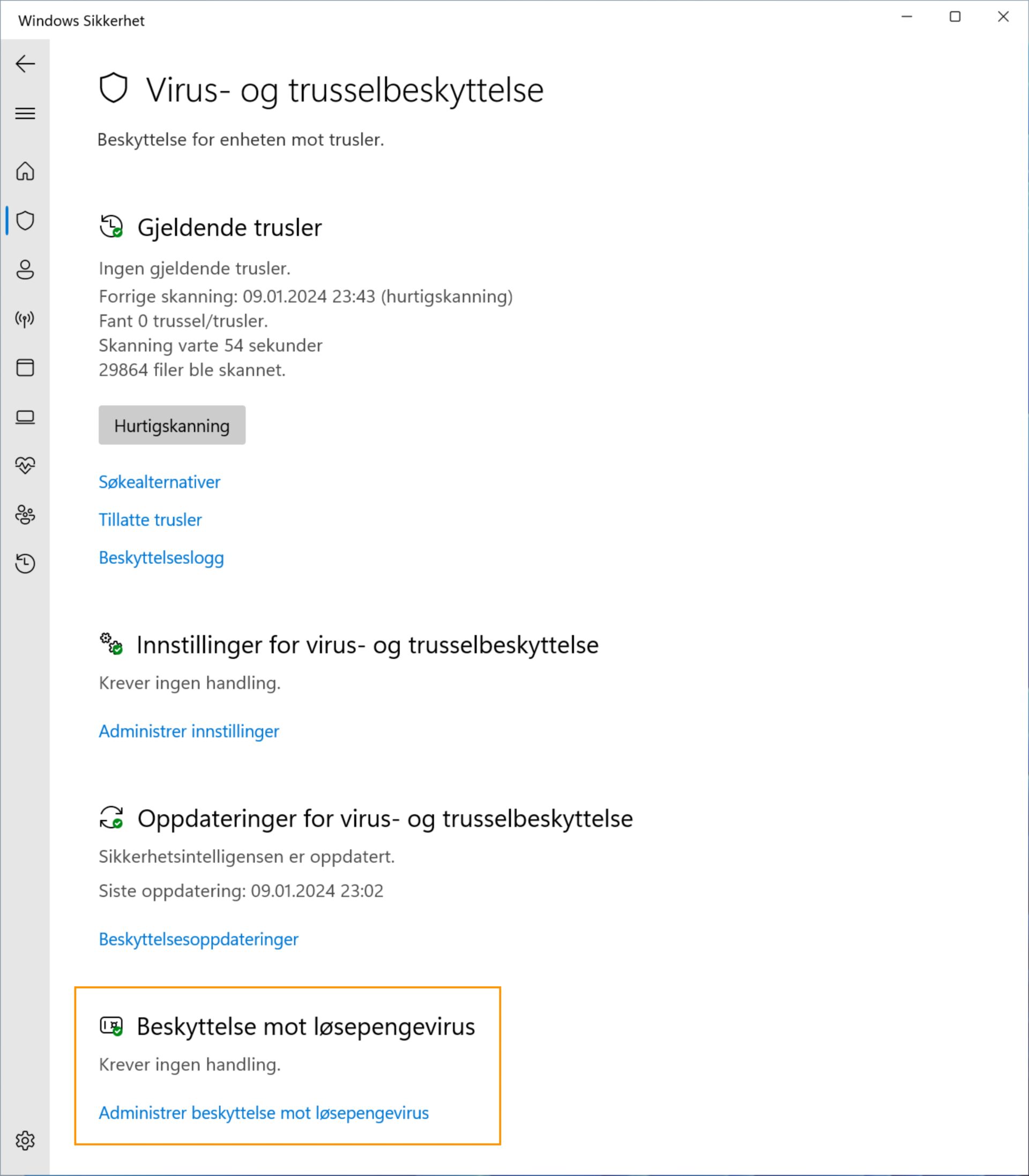 Under Virus- og trusselbeskyttelse velger du Beskyttelse mot løsepengevirus.