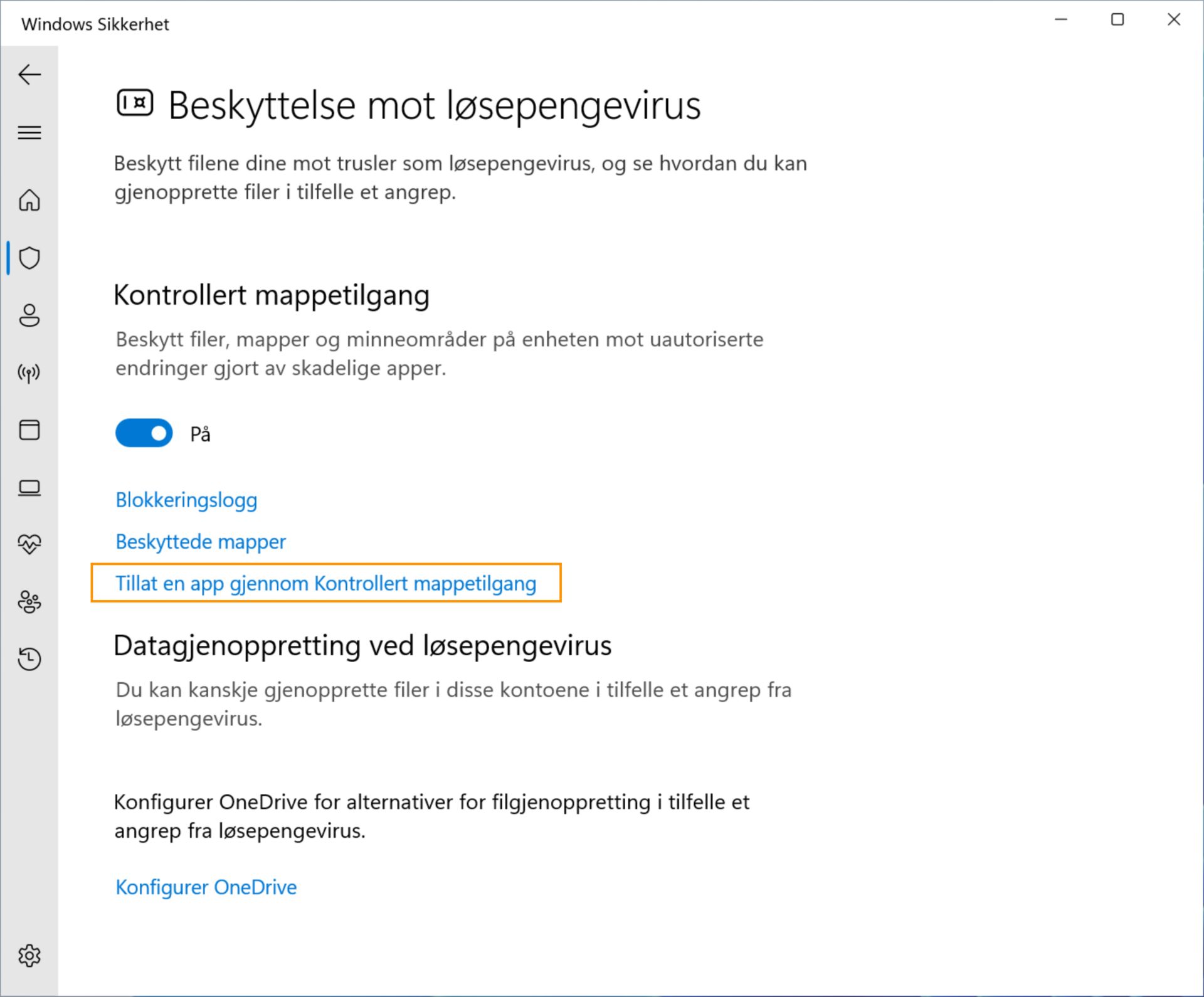 Velg alternativet Tillat en app gjennom Kontrollert mappetilgang.
