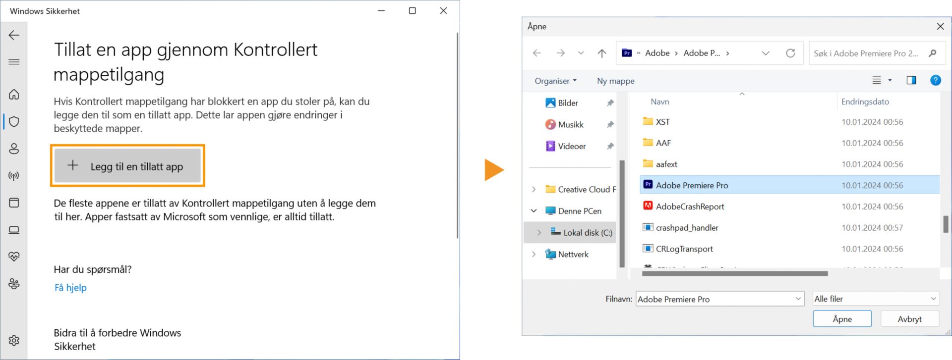 Hvis du vil starte Premiere Pro, Adobe Media Encoder eller After Effects når Kontrollert mappetilgang er aktivert, gjør du følgende: