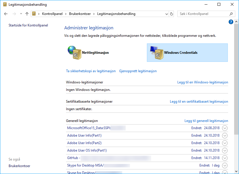 Naviger til Start > Kontrollpanel > Brukerkontoer > Legitimasjonsbehandling.