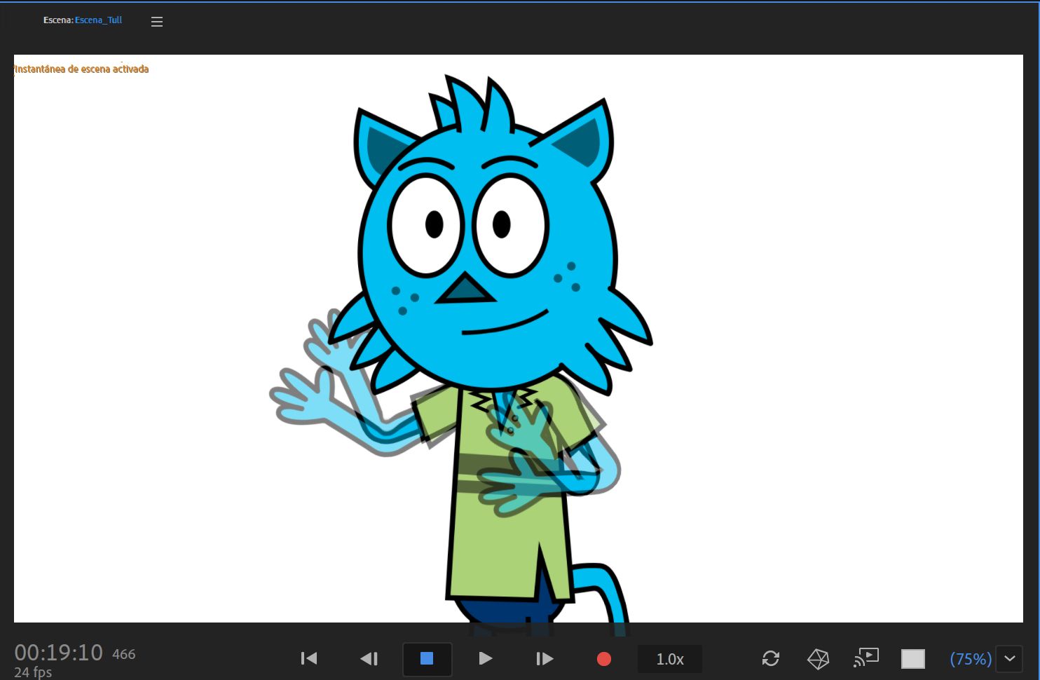 La opacidad de la marioneta activa disminuye a medida que aumenta la opacidad de la instantánea. Para cambiar la visibilidad de la instantánea, elija Escena > Aumentar la opacidad de la instantánea (Comando+Opción+=) o Disminuir la opacidad de la instantánea (Comando+Opción+-).