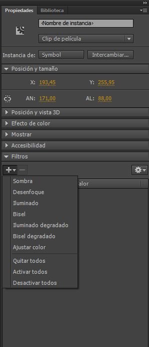 2. En la sección Filtros del inspector de propiedades, haga clic en el botón y seleccione Sombra.