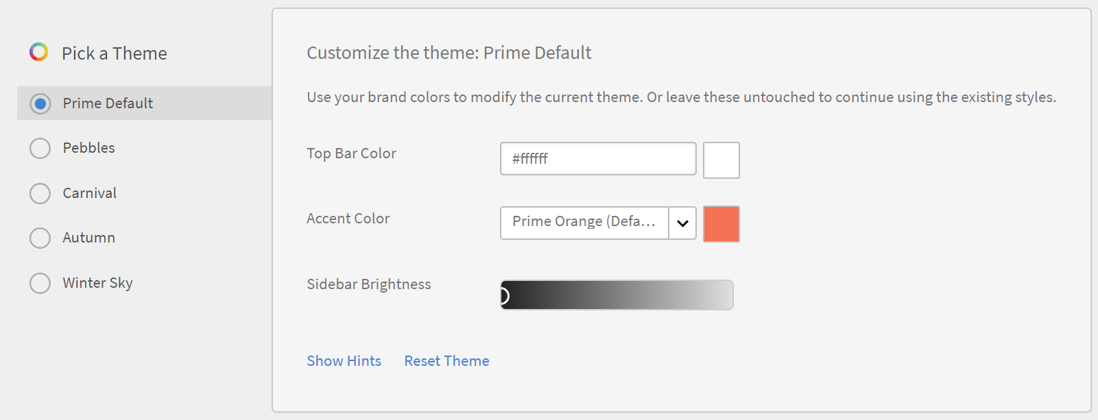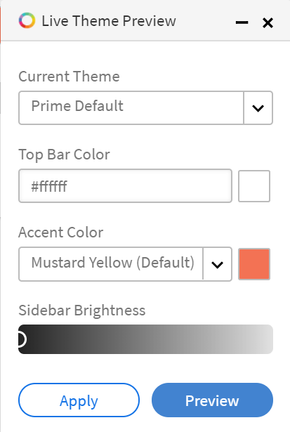 Además, puede editar el Color de barra superior, Color de énfasis y el Brillo de barra lateral. Puede utilizar sus propios colores de marca para estos elementos clave de la interfaz.