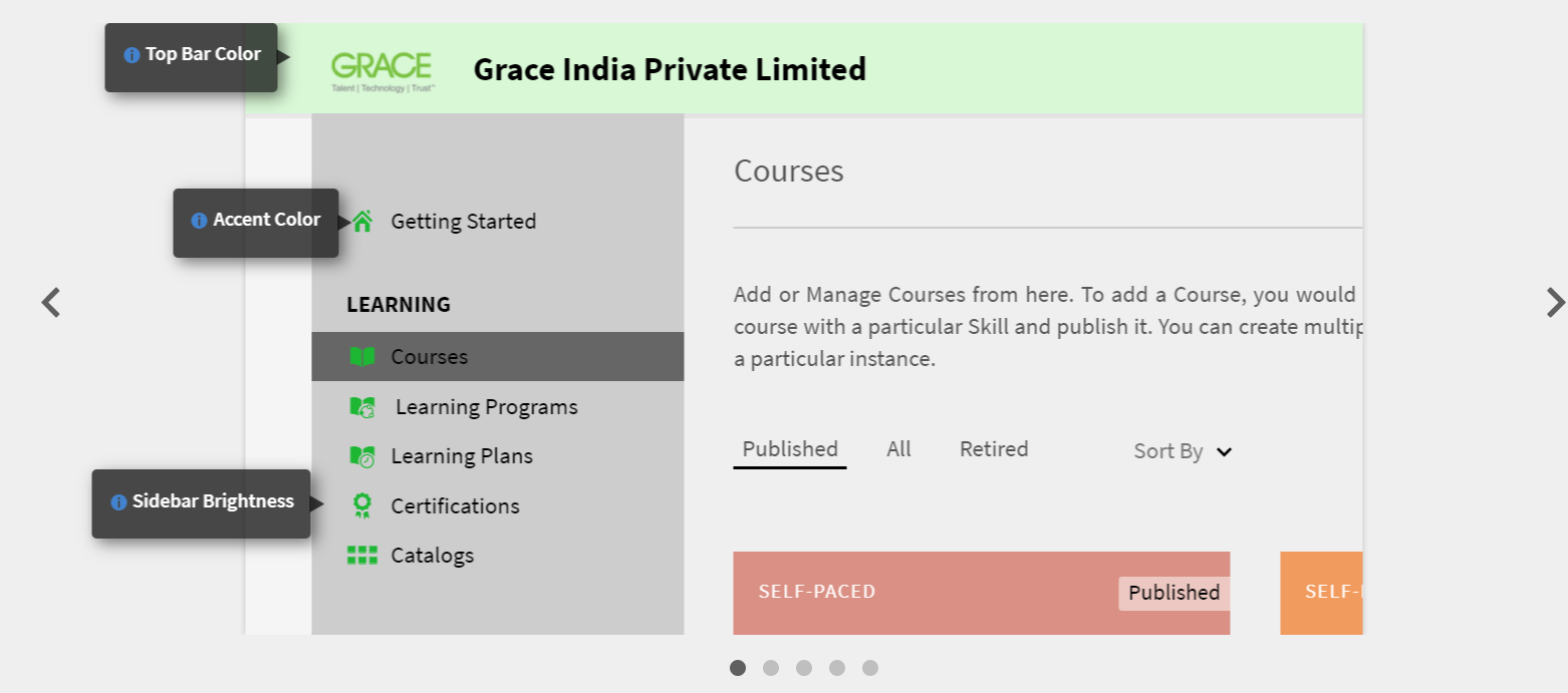 Utilice la configuración del logotipo y la pancarta para mostrar el logotipo de su empresa en Captivate Prime. Configure las opciones de marca para definir el dominio de la empresa en la URL, mostrar el nombre de la organización y mostrar esquemas de color que coincidan con la marca de la organización. Para configurar los ajustes de marca: