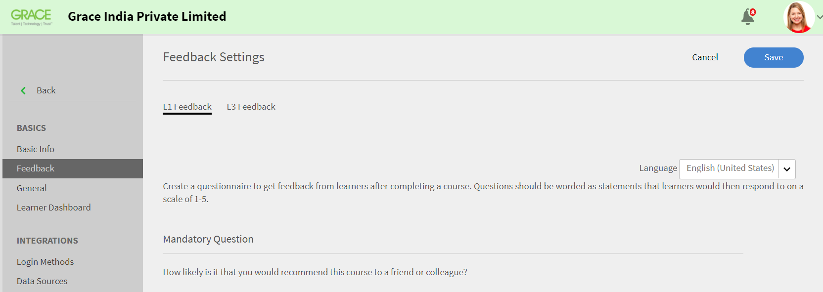 Para configurar los comentarios de L1, haga clic en la ficha Fuente L1. Verá las opciones para configurar una pregunta obligatoria y varias preguntas opcionales. Estas son las preguntas que un alumno ve mientras proporciona comentarios después de completar un curso. Las preguntas se formulan como instrucciones para que los alumnos puedan seleccionar su respuesta en una escala de 1 a 5.