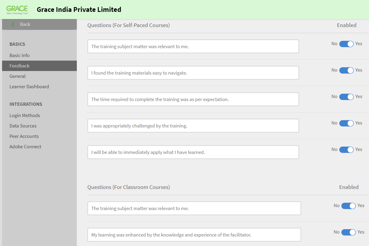 Puede activar o desactivar las preguntas predeterminadas o modificar por completo las preguntas predeterminadas para adaptarlas a sus necesidades. Por ejemplo, puede eliminar la pregunta predeterminada "La cuestión de la formación era relevante para mí" y añadir reemplazar la pregunta por "La formación me pareció útil y relevante".
