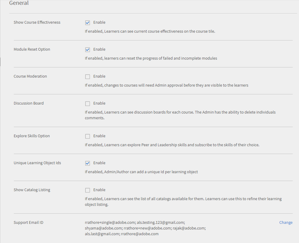 La configuración general de Captivate Prime permite a los administradores configurar opciones genéricas que afectan a otras funciones de la aplicación. Por ejemplo, puede utilizar la configuración general para especificar si la eficacia del curso puede hacerse visible para los alumnos. Para configurar los ajustes generales: