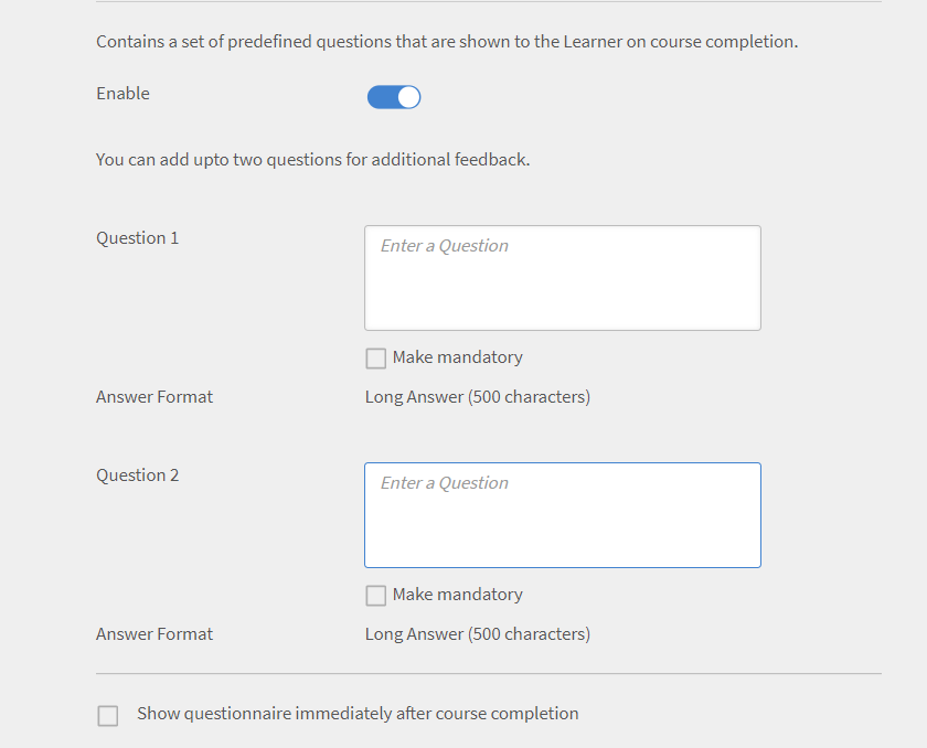 Seleccione el Mostrar cuestionario inmediatamente después de finalizar el curso si desea que los alumnos vean el cuestionario de comentarios inmediatamente después de completar el curso.