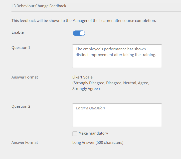 Comentarios de L3 contiene las preguntas que se envían al responsable del alumno una vez que este finaliza un curso. Los comentarios de L3 permiten al administrador realizar un seguimiento de los cambios en el comportamiento o la aptitud de un alumno a lo largo del tiempo. Para configurar este comentario, en la página Comentarios, haga clic en la ficha Comentarios de L3. Verá una pregunta predeterminada. El responsable debe responder a esta pregunta utilizando una escala de clasificación de cinco puntos.