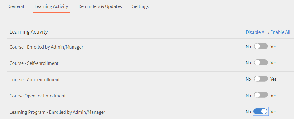 Haga clic en el botón de alternancia para cualquier actividad que desee activar un correo electrónico. En este ejemplo, supongamos que hace clic en Programa de aprendizaje: Inscrito por el administrador/responsable.