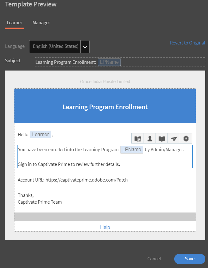Puede modificar la plantilla de correo electrónico predeterminada. Para ello, haga clic en el evento. En este ejemplo, haga clic en Programa de aprendizaje - Inscrito por administrador/responsable.
