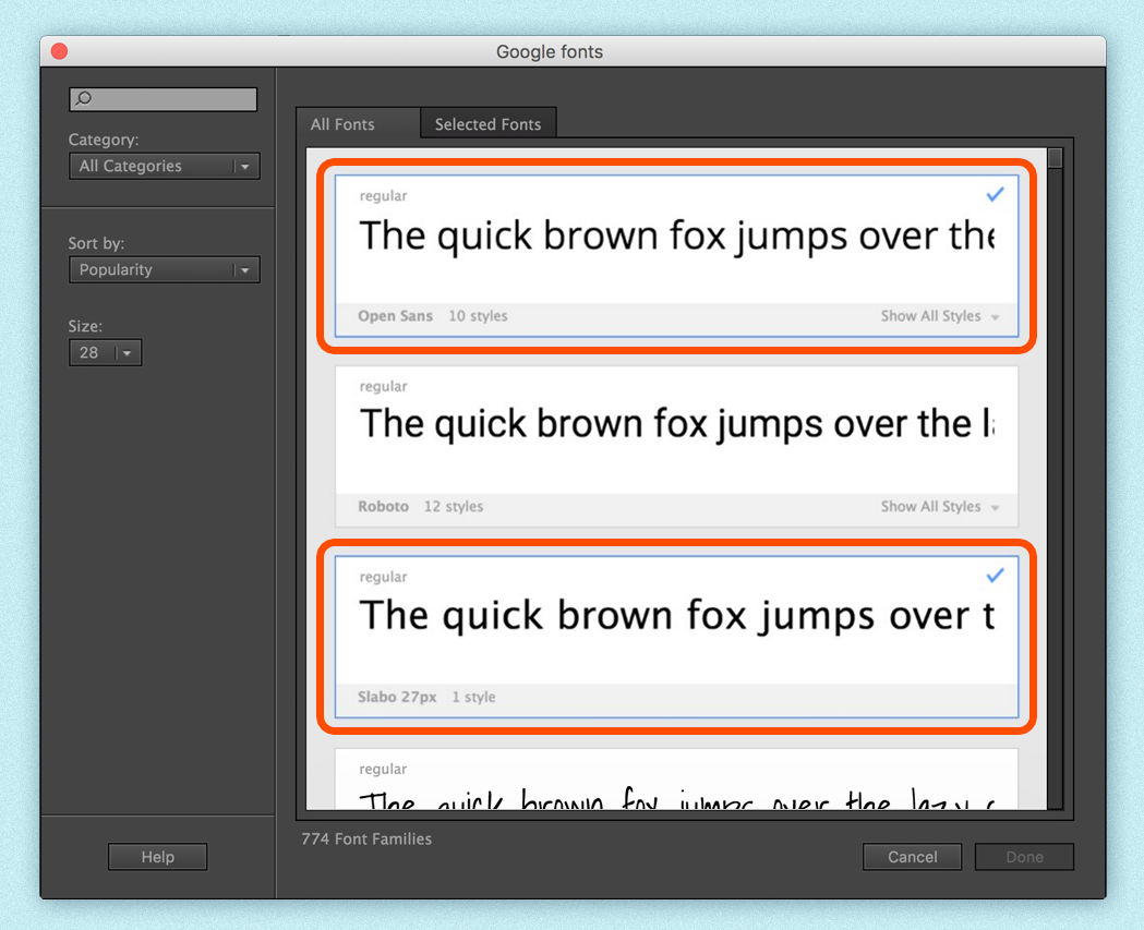 To add a font to the document, click the font that you want to use and select Done. A check mark indicates that the font is selected.  You can also select and add multiple fonts. You can also select and add multiple fonts.