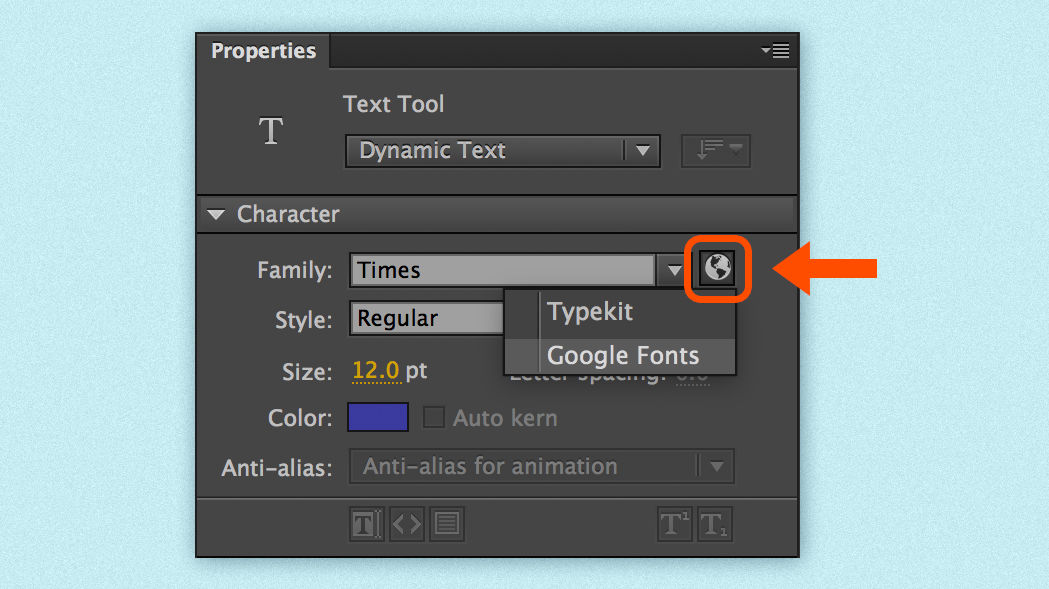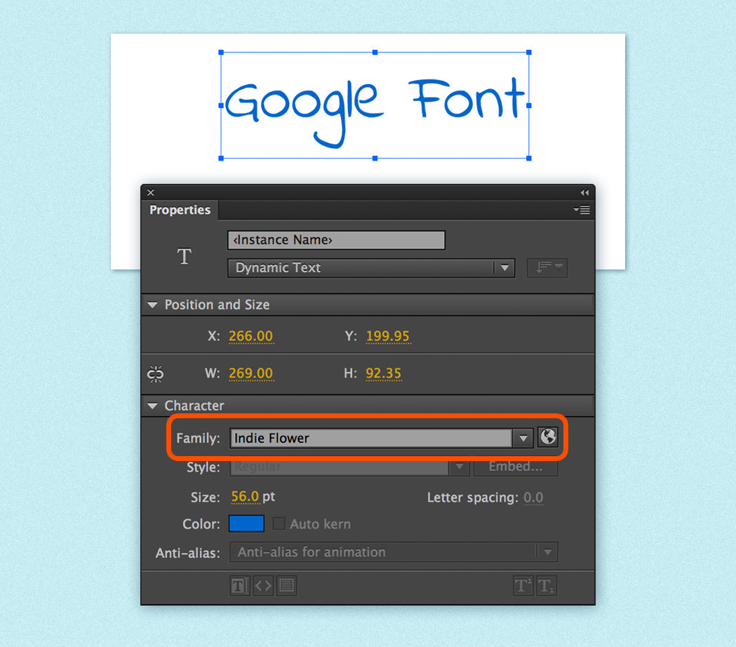 To view the added fonts in Animate, select Character > Family in Property Inspector. Selected Google font in the Property inspector Selected Google font in the Property inspector