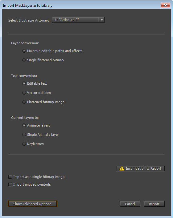 3. (Optional) To generate a list of items in the AI file that are incompatible with Animate, click Incompatibility Report. The Incompatibility Report button appears only if incompatibilities exist with Animate in the AI file.