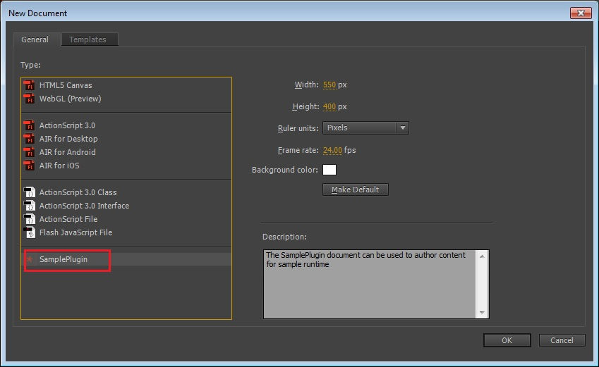 2. In the New Document dialog box, choose an intent of your choice from the tabs at the top of the screen such as Character Animation, Social, Game, Education, Ads, Web, and Advanced. Select the new document type added by the custom platform plug-in and click OK. You can see the following changes: