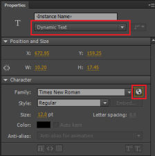 2. In the Properties panel, select Dynamic Text and click the Add web fonts button next to the Font Family dropdown box.