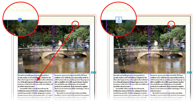 Each InDesign frame and object group displays a small blue square on its top edge. To anchor an object in an accessible location in the text flow without changing the original position of the object, click and hold the blue square, and then drag it to the desired location within the text and release. The blue square changes to an anchor icon indicating that the object is anchored.