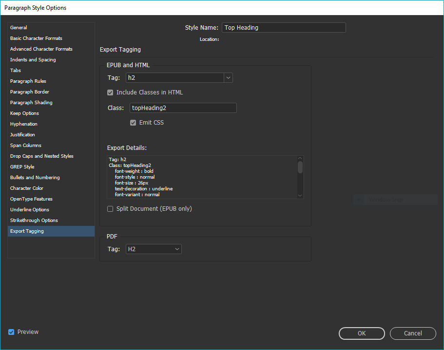 Defining export tags in a paragraph style creates an association between the text using that style and its role in the semantic structure of the PDF document. You can set any paragraph style to one of eight basic PDF tags.