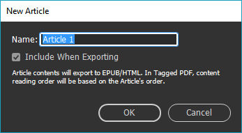 To establish the reading order in InDesign, open the Articles panel (Window > Articles) and click the desired object or objects on the page to include in the article. Drag the objects into the Articles panel, and release the mouse. Objects are listed in the order that you click them. Name the article when prompted to, or keep the default name Article 1. Alternatively, you could use Select All (Cmd/Ctrl-A) and click the New Article button at the bottom of the Articles panel to add all selected objects and create a new article in one step (you can rename it later). Objects are given default names based on the object’s type and content. If an object has already been given a specific name in the Layers panel, it retains that name in the Articles panel.