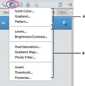 Click the Create New Fill or Adjustment Layer button in the Layers panel, and choose the fill type you want to create. (The first three options listed in the panel are fill layers, the others are adjustment layers.)