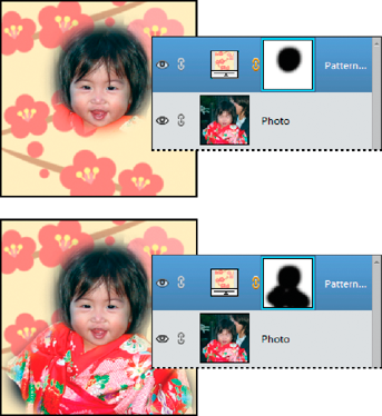 A layer mask prevents sections of a layer, or an entire layer, from being visible. You use the mask to show or hide sections of an image or an effect. When the layer mask (right thumbnail) attached to an adjustment layer is completely white, the adjustment effect is applied to all underlying layers. If you don’t want to apply the effect to certain portions of the underlying layers, paint the corresponding area of the mask with black. When attached to a fill layer, the mask defines the filled‑in area in the fill layer.