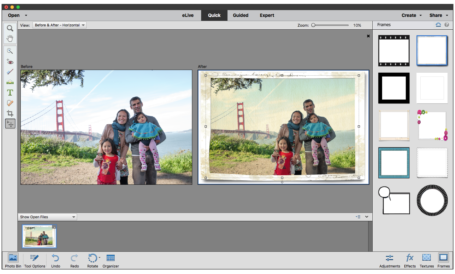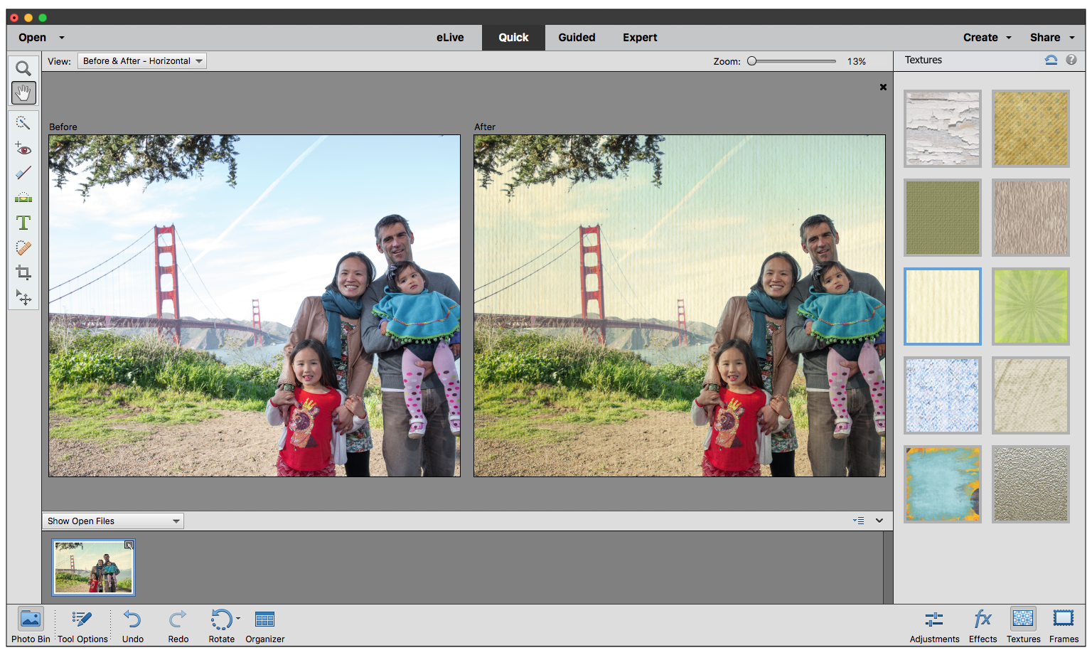 The Quick mode groups basic photo-fixing tools in one place, to quickly fix the exposure, color, sharpness, and other aspects of an image. From Photoshop Elements 12, in addition to correcting your photos, you can also transform your photos into professional-looking objects of art. Three new panels - Effects, Textures, and Frames - are now available.