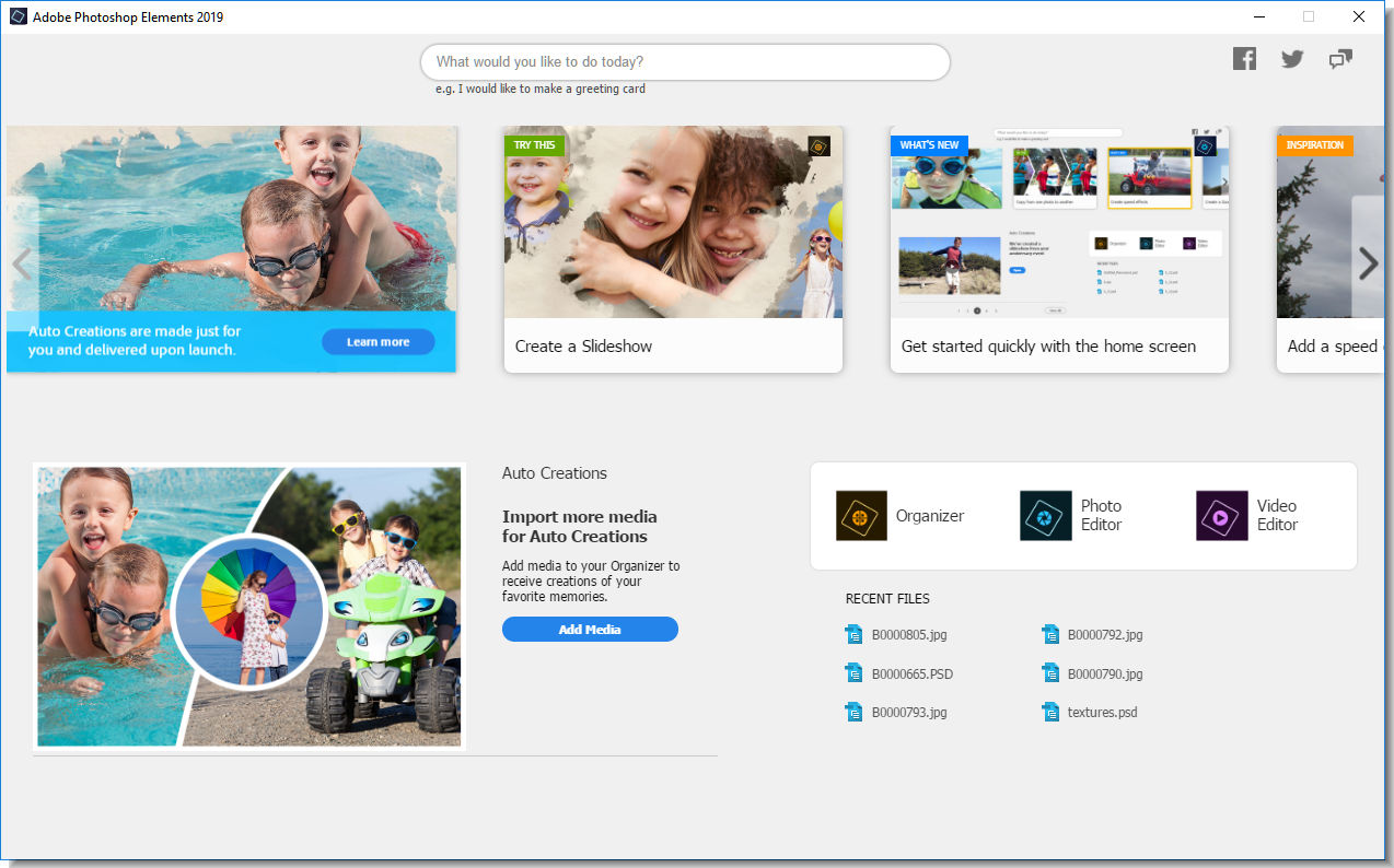 In the new Elements home screen, auto-generated photo and video slideshows and collages are created just for you and delivered upon launch. Plus, see what’s new since your last version, discover fun things to try, and get inspiring ideas, help, and tutorials.