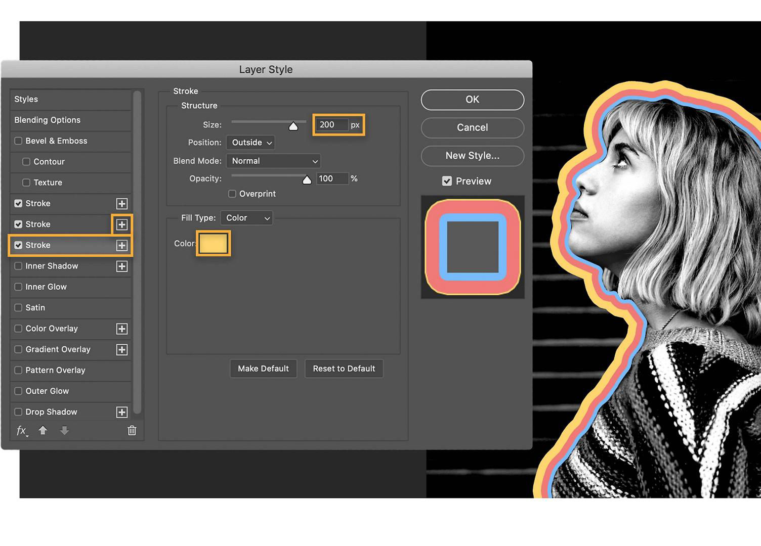 Duplicate the second Stroke, select the Stroke below it, and change the color and size. We chose #FFD56E and 200px (the largest stroke should be at the bottom of the list). Then click OK.