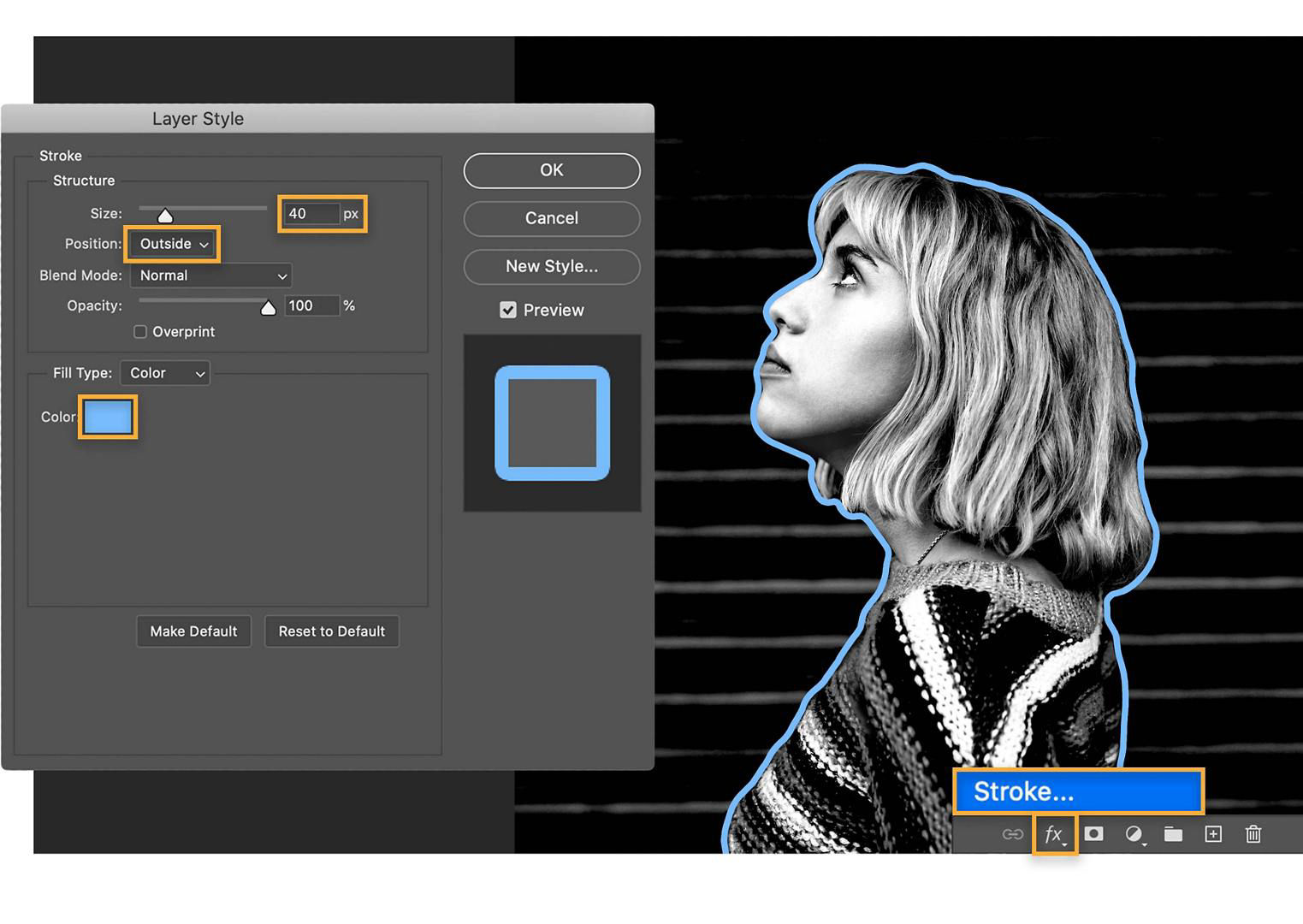 Click the fx button in the layers panel and add a Stroke. In the Layer Style window, change the Color, we chose a soft blue (#79BBFD). Next, change the Position to Outside and the Size to 40 pixels.