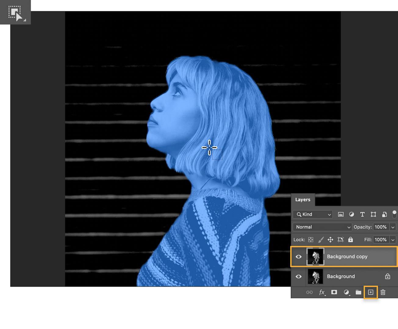 Drag your image layer on the Create New Layer icon in the Layers panel to make a copy. Choose the Object Selection tool from the toolbar and hover over the figure. When it turns blue, click to make a selection.\