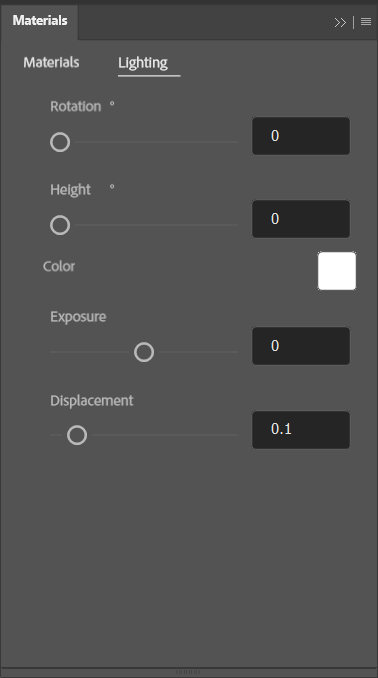 The lighting applied to materials can be edited in the Lighting Panel. Here there are controls to change the rotation and height of the lighting relative to the material’s surface.