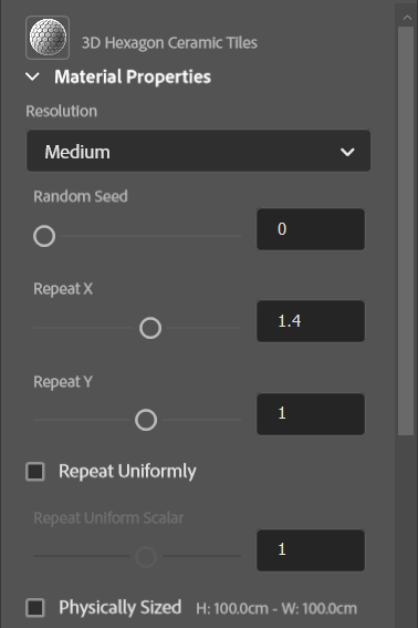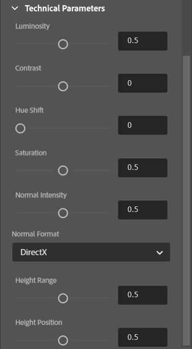 Technical Parameters: These parameters are similar to the image adjustments that are native to Photoshop, but applied specifically to the material. These are defined by the author and are visible in most .sbsar files downloaded from the Adobe 3D Asset page.