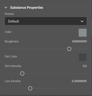 Substance Properties: These are the unique properties of a material that affect various aspects of its appearance. They are defined by the author of the material during the creation process in Substance 3D applications. Some examples of this would be the color of dirt on a material and the intensity of the dirt, as seen on the left image.