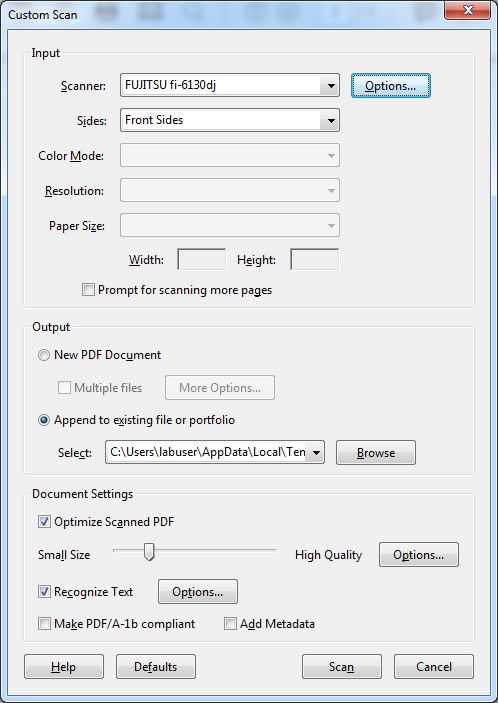 Tylko skanery z dupleksem — po aktualizacji oprogramowania Acrobat z lipca 2015 r. wybranie opcji Strony > Obie strony w oknie dialogowym Skanowanie własne, a także Ustawienia domyślne (Autowykrywanie trybu kolorów, Czarno-biały itd.), powoduje zeskanowanie tylko przedniej strony.