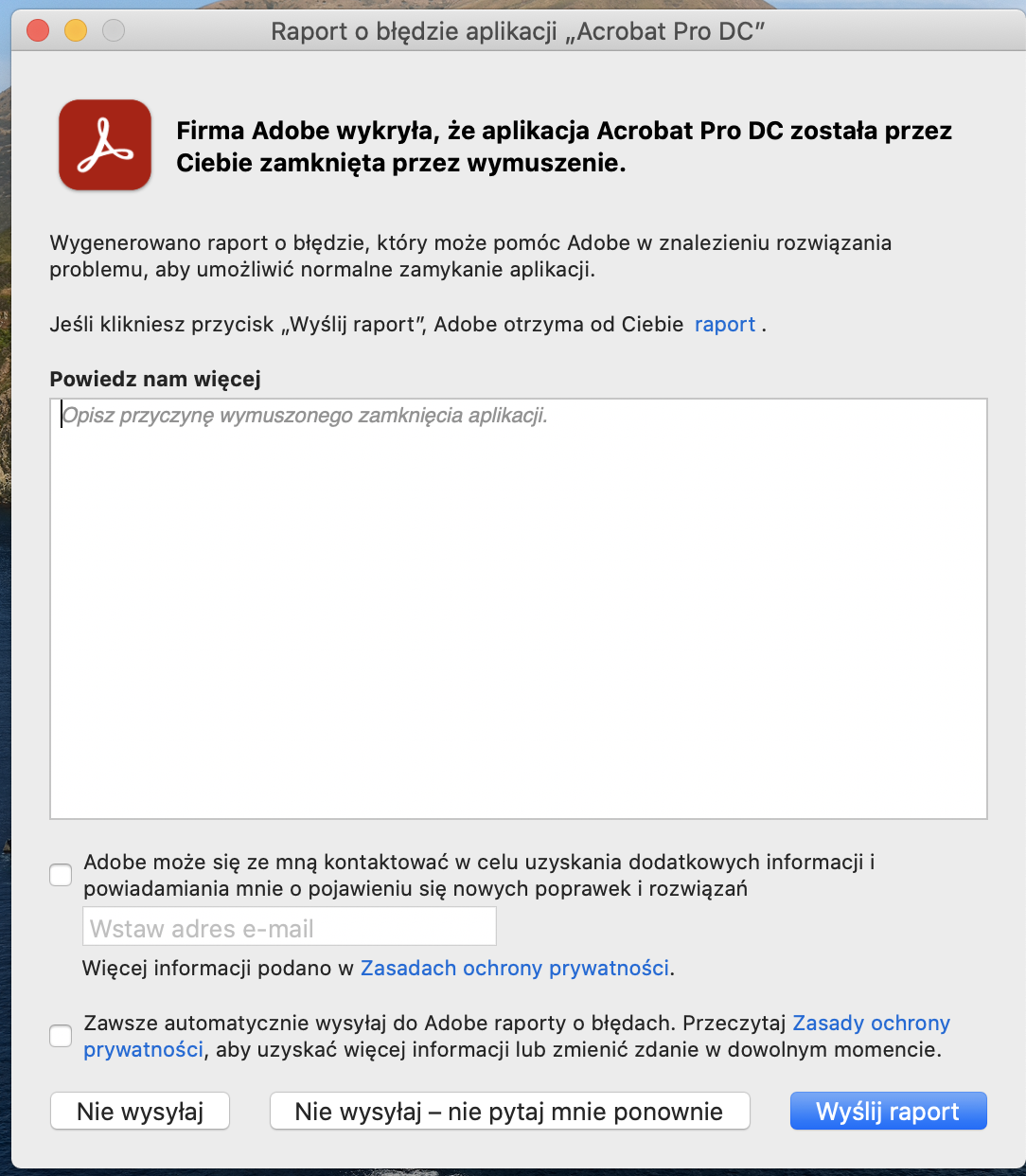 W przypadku wystąpienia problemu z programem Acrobat lub Reader można przesłać raporty o awariach poprzez okno dialogowe narzędzia Adobe Crash Reporter. Narzędzie Adobe Crash Reporter może zebrać dziennik działań aplikacji w momencie wystąpienia awarii. Informacje te są przesyłane do bazy danych, a następnie na ich podstawie zespół inżynierów programu dokonuje analizy awarii i opracowuje rozwiązania.