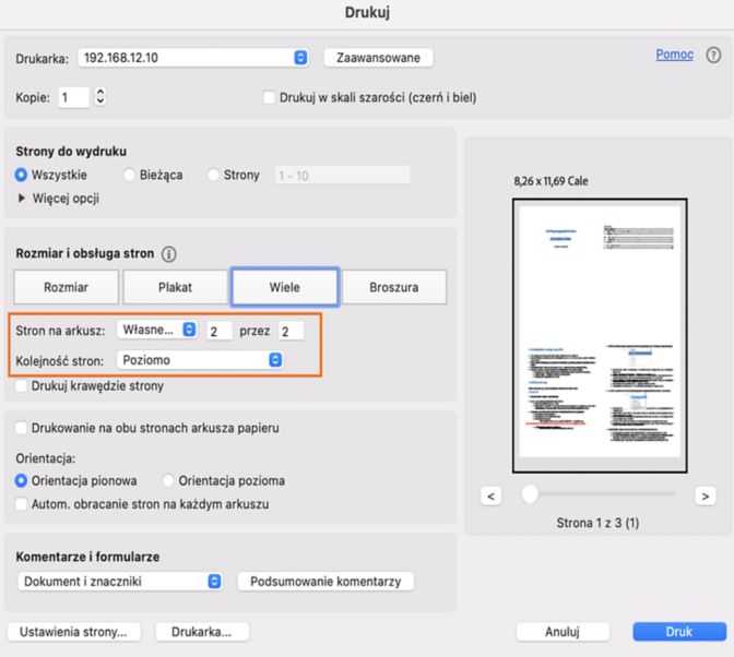 Możesz wydrukować więcej niż jedną stronę dokumentu PDF na jednym arkuszu papieru. Drukowanie wielu stron na kartkę jest też zwane drukiem „N-up”, (na przykład 2-up lub 6-up, zależnie od liczby stron na kartce). Możesz określić sposób uporządkowania stron – poziomo wzdłuż arkusza lub pionowo w kolumnach.