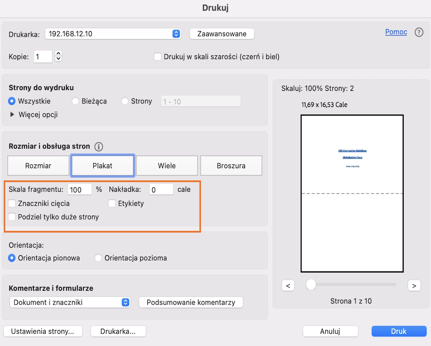 W sekcji Opcje rozmiaru i obsługa stron w oknie dialogowym Drukuj wybierz Plakat.