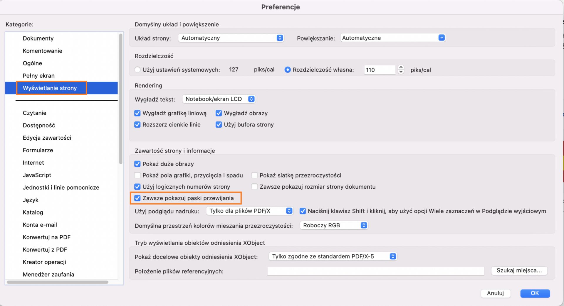 Procedura włączania paska przewijania w programie Acrobat lub Acrobat Reader